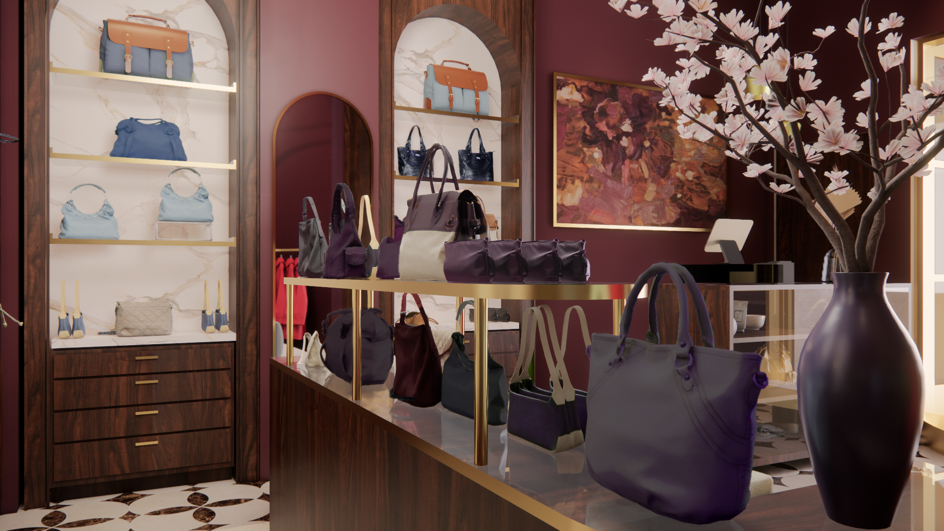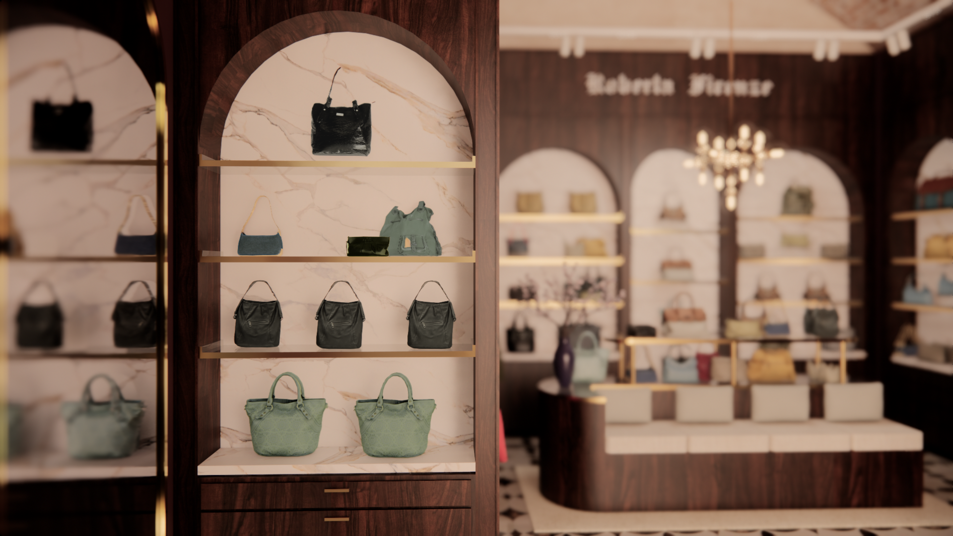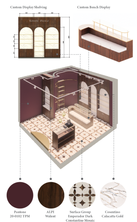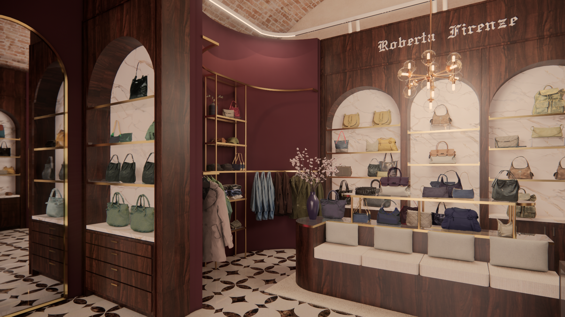 This project collaborates with local Florentine shop owner Roberta to redesign her boutique layout and window display. Her brand identity is deeply rooted in Florentine heritage and a commitment to Italian leather craftsmanship, appealing to those who value quality, tradition, and the artistry of Made in Italy. The concept uses rich purples, Calacatta marble, and dark walnut tones to