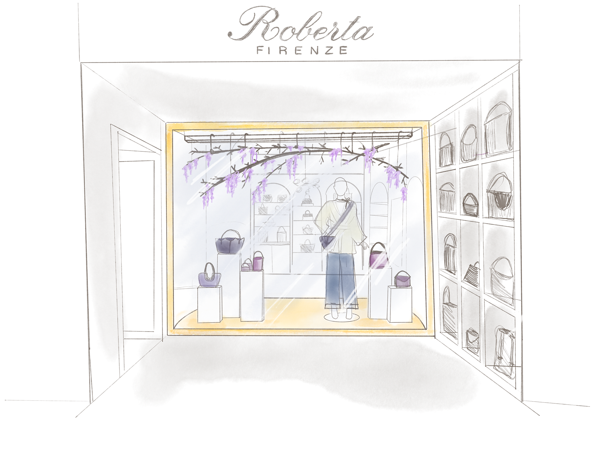 The 400 sq. ft. space integrates custom wall cabinetry for display, a bespoke bench for seating, and a dedicated accessory area showcasing hats, scarves, and shawls in luxurious fabrics such as cashmere, silk, and linen, curated to complement the leather pieces. A spring window display inspired by the wisteria pergola at the Bardini Garden reflects the beauty of spring in bloom while maintaining visual openness inside the store. The design guides customers intuitively through the space, showcasing Roberta’s craftsmanship and selected collections in a modern, elegant, and inviting way.
